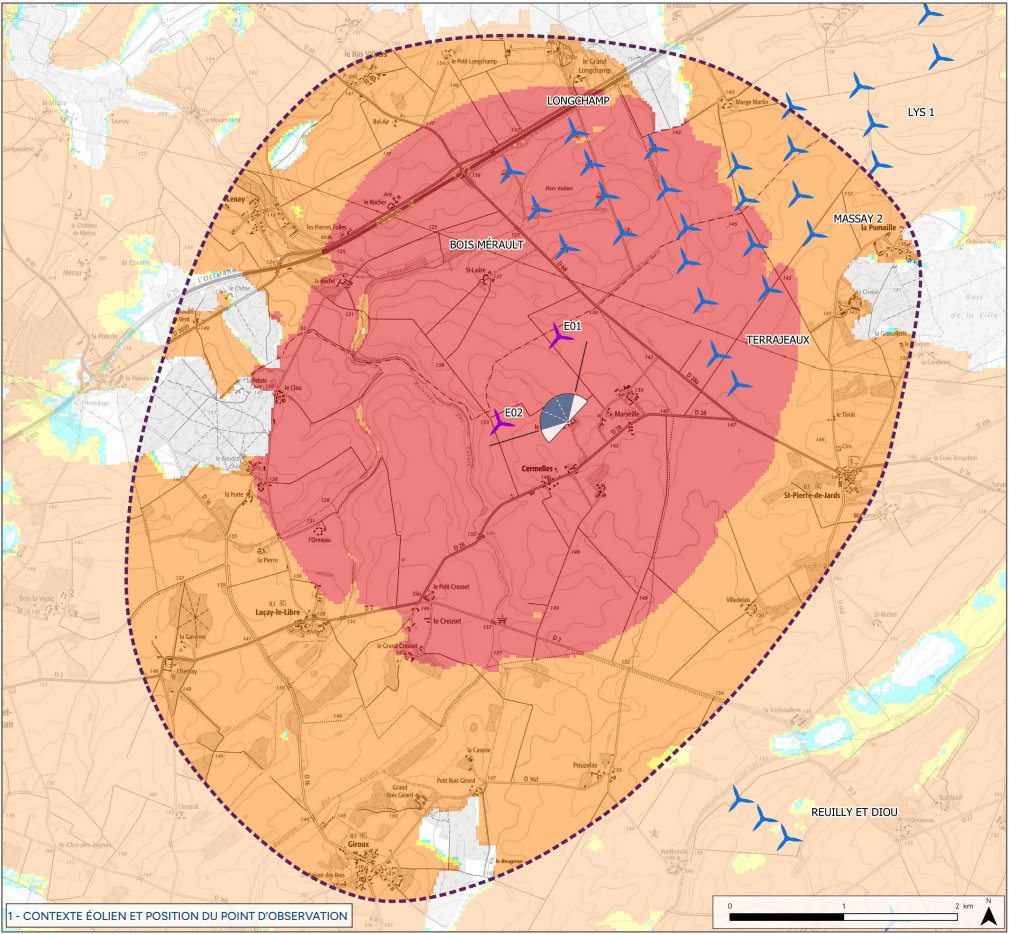 Depuis ce point, les vues sont relativement dégagées sur le milieu agricole. La végétation ainsi que le relief viennent ponctuellement limiter la profondeur des perceptions. Cependant, quelques parcs éoliens sont perceptibles à l’horizon (parcs éoliens de Massay 2, Terrajeaux, Bois Mérault et Longchamp) avec des hauteurs apparentes hétérogènes. Dans ce paysage, le projet les Beaux Piliers prend place en arrière-plan des parcs des Longchamp et de Massay 2. A noter que les deux éoliennes du projet se superposent entre elles.